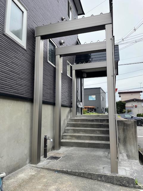 カーポートの部材を利用しながら、階段を囲うという提案をさせていただきました。 カーポート用のサイドスクリーンで吹込みを止めました。 建物とカーポートの...