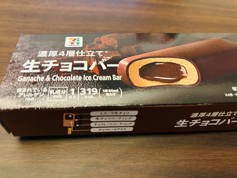 お疲れ様です。 先日セブンイレブンで気になった商品が あったので購入してみました♪♪ 【濃厚4層仕立て 生チョコバー】 見るからに濃厚そうなものでした...