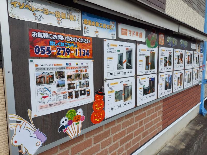 おはようございます! 山梨県甲斐市にありますイソベトーヨー住器です。 外の掲示板を秋バージョンへリニューアルしました~。 施工例には目安金額と工期も入...