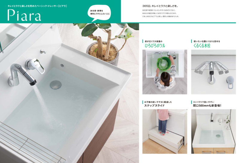 洗面化粧台『ピアラ』 身支度・家事を便利ラクにしたい人に! キレイとラクと楽しさを究めたベーシック・ドレッサー 365日、キレイとラクと楽しさを。 身...