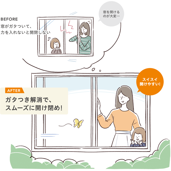 ~ リプラス 窓にまつわるお悩みもパッとスッキリ! ~ ☑ 開け閉めのお悩みスッキリ 引違い窓のガタつきは、窓の変形や戸車の劣化が主な原...
