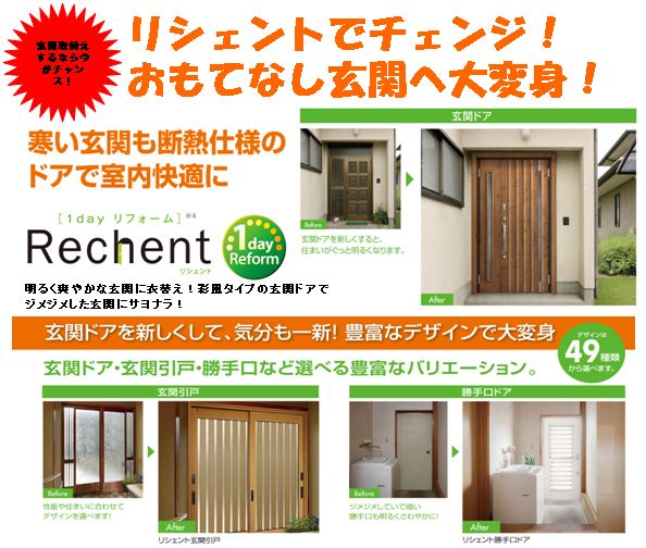 大好評リシェント! 家の入口は、玄関ドア・引戸・勝手口ドアなどいろいろあります。リフォームトドア リシェントは玄関ドア・玄関引戸・勝手口ドア等、品揃え...
