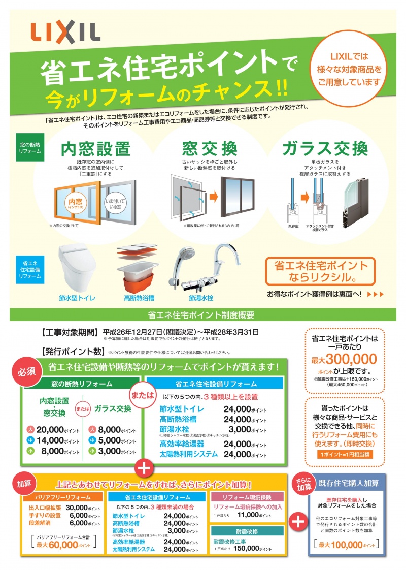 リフォームを考えている方、悩んでいた方、今がチャンスです! 平成26年12月27日に閣議決定された「省エネ住宅に関するポイント制度」が補正予算の成立後...