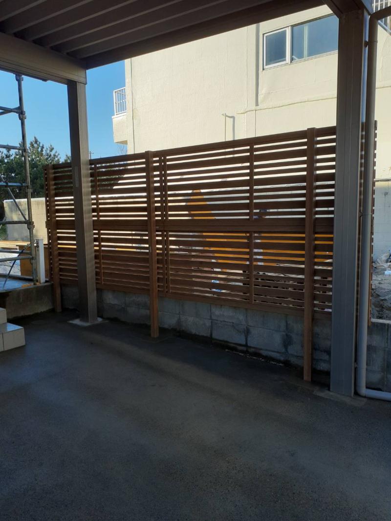 カーポートに沿わせてウッド調フェンス施工させて頂きました。 風除けと目隠しを兼ねる効果があります。 お気軽にご相談ください。