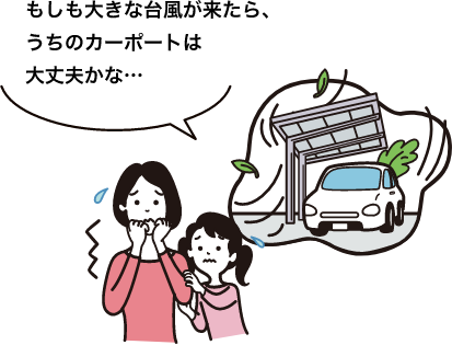 カーポートやテラスの 強風対策で、憂いのない毎日へ。 記録的な暴風雨は、もはや限られた地域だけではありません。 全国のどの地域においても、想定外の事態...
