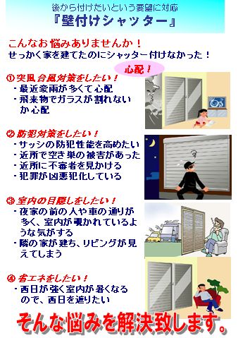 住まいのお悩み解決! 雨・突風・防犯など、後付けシャッターで解決しましょう。 ※現場によっては取り付け出来ない場合もありますのでご了承御願いします。 ...
