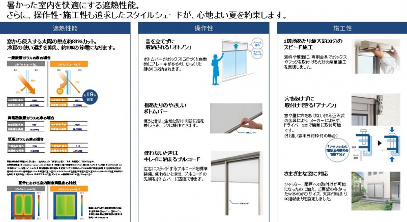 住まいのお悩み解決! これからの熱い日差し!エアコンだけに頼らず、スタイルシェードで窓からの侵入する太陽の熱をカット! 冷房の使い過ぎを抑え、節電にな...