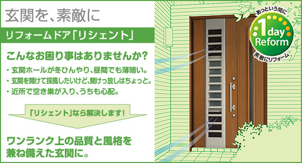 玄関を新しく取り替えたい! でも玄関の工事に何日もかけるのはちょっと… “リシェント”ならそんなお悩みを解決致し...