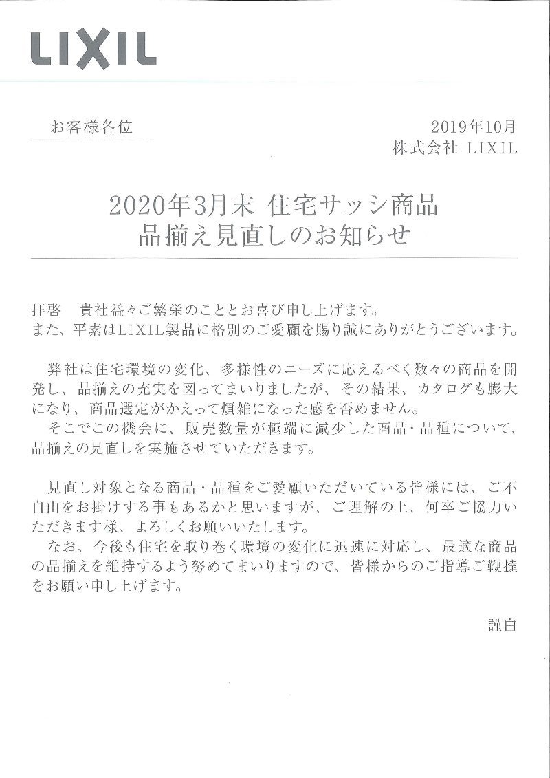 LIXILサッシ 品揃え見直しのお知らせ
