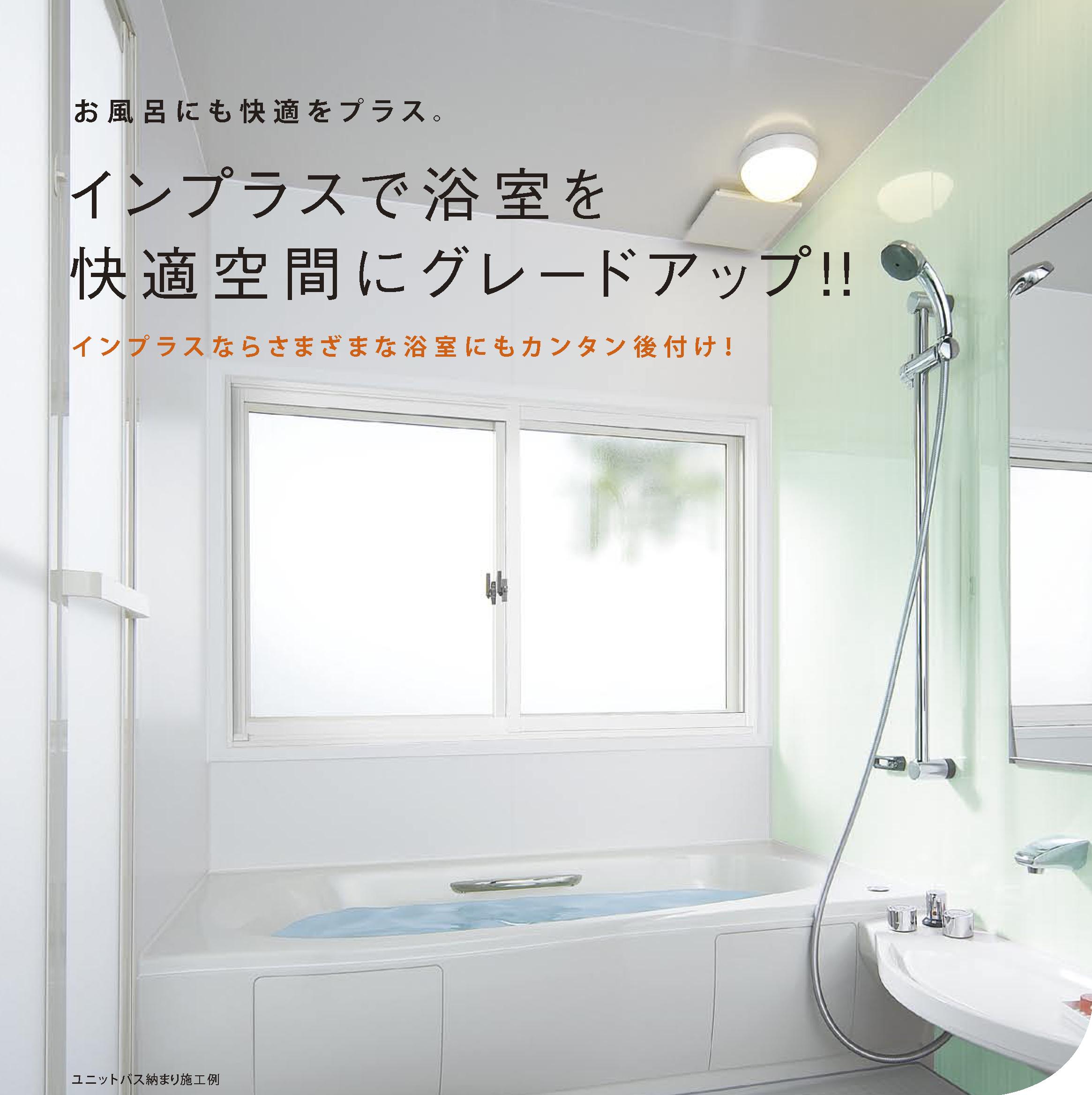 浴室 の不満も 即解決。 答えは「窓」に有りました。 インプラス 浴室仕様 登場! 浴室を快適空間にグレードアップしませんか。 詳し...