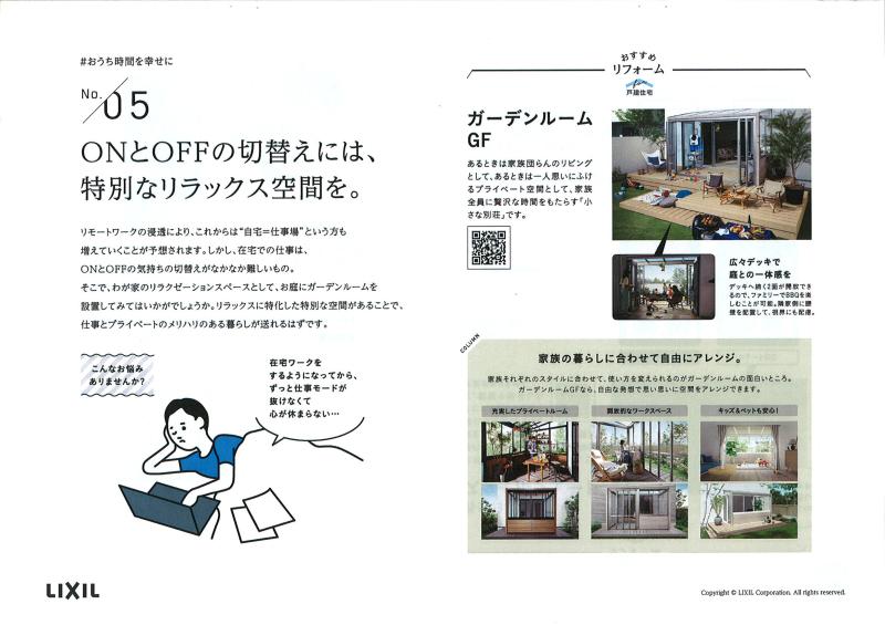 おうちで過ごす時間を快適にする かんたんリフォームはいかがでしょうか。 05.ガーデンルームで我が家にリラクゼーションスペースを 06.室内熱中症予防...