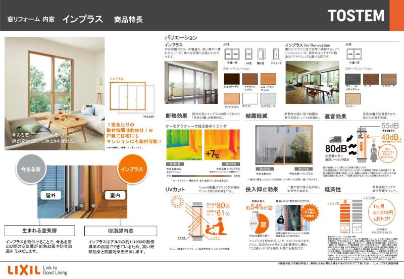 今ある窓にプラスするだけで快適空間に。 冬の寒さ対策にいかがでしょうか。 断熱効果だけでなく遮音効果もあるのでオススメです。 インプラスについてもっと...