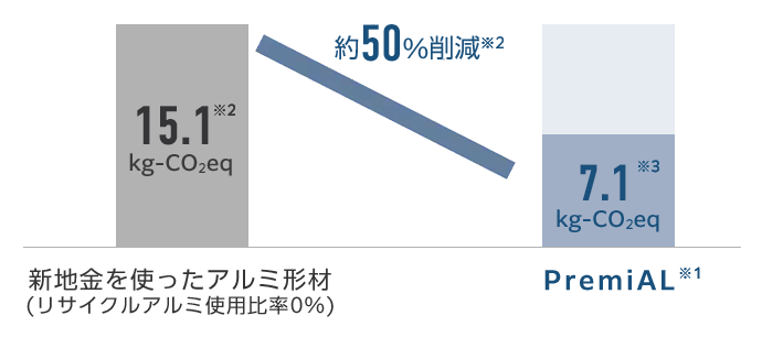 - ※1PremiALの原材料(LIXIL製造の6063材・異種合金・購入ビレット)のうち、LIXIL製造分の6063材についてリサイクルアルミを60%以上使用。異種合金・購入ビレットは算出対象外。